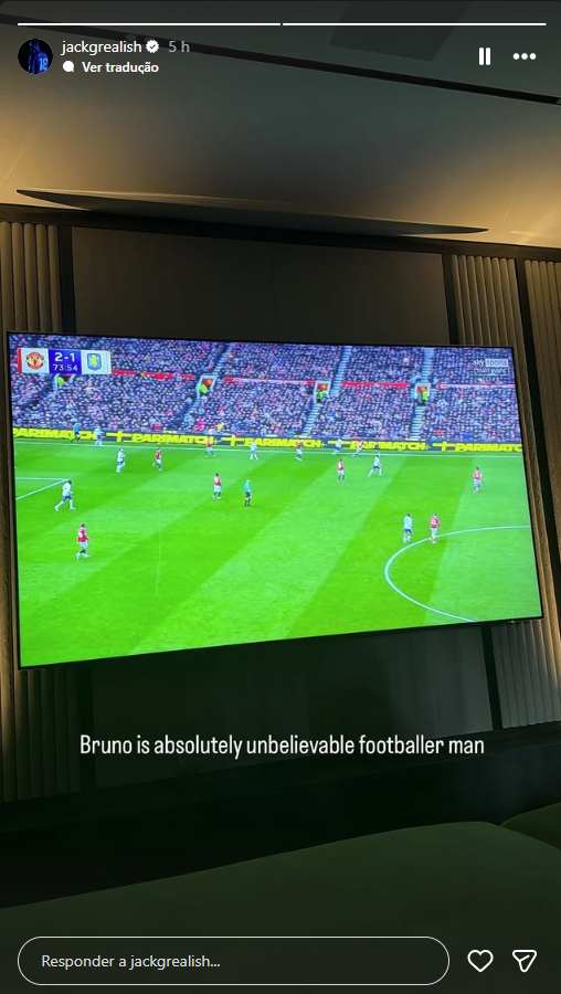 Jack Grealish, jogador do Manchester City que está emprestado ao Everton, partilhou uma story no Instagram, instantes após a segunda assistência de Bruno Fernandes no jogo, com uma legenda que diz tudo sobre o que pensa do internacional português: «Bruno é um jogador absolutamente inacreditável».
