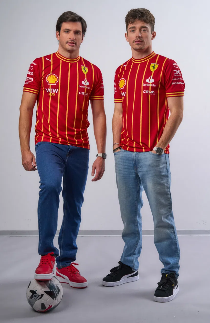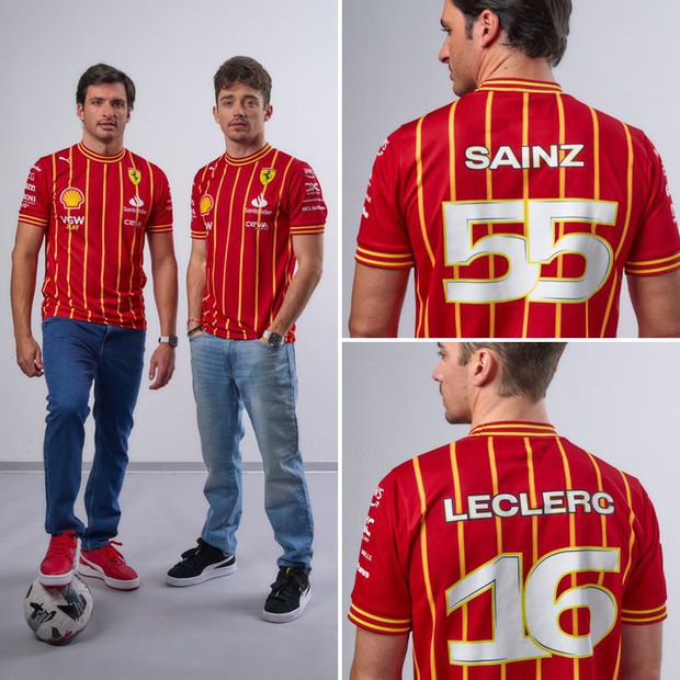 Para celebrar o Euro 2024, a Ferrari lançou duas camisolas inspiradas no futebol. Quem as quiser comprar, poderá escolher entre o nome e número de Carlos Sainz ou de Charles Leclerc, os dois pilotos da equipa italiana.