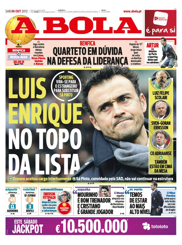 Na altura, Sá Pinto tinha sido despedido e o Sporting liderado por Godinho Lopes buscava um treinador. Ontem, quando questionado pelo nosso jornal sobre se lembrava se tinha recebido algum contacto formal, Luis Enrique negou-o. «Não. Pelo menos não me lembro, mas sempre tive um carinho especial por uma razão muito simples: o clube da minha terra e no qual me formei também é Sporting, mas de Gijon e as camisolas são iguais. Daí que há muito conheço este clube», respondeu num tom muito bem-disposto.