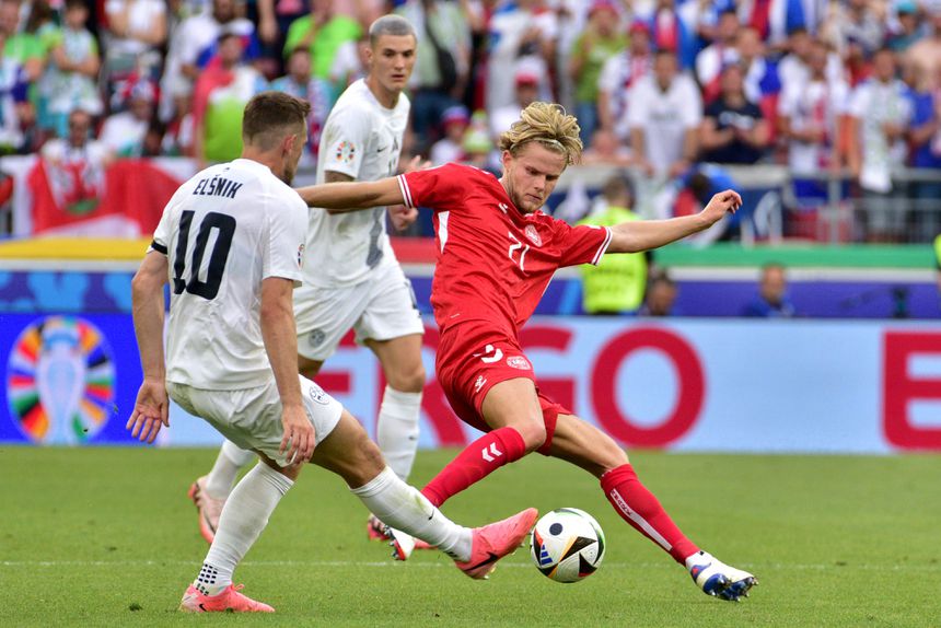 A vencer, os nórdicos nunca abdicaram do futebol apoiado, ao qual respondia a Eslovénia com uma linha defensiva segura, sem deixar espaço a Hojlund e Wind, e deixando o adversário sempre em alerta com os lançamentos longos para Sporar, que sabe pisar a zoma cega dos centrais e a linha do fora de jogo, mas mantém índices de definição muito baixos. Ainda assim, e porque ao lado dele há um avançado que trata muito melhor o couro, foi novamente Sesko a fazer levantar o estádio com um potente remate de meia distância ao poste. No lance seguinte, após um canto, Janza atirou forte (gesto que havia feito várias vezes na primeira parte), a bola desviou em Hjulmand e terminou dentro da baliza. Quando o caminho se adivinha difícil, o desvio é a melhor alternativa para chegar ao destino. E pode dizer-se que os eslovenos não mereciam ficar perdidos.