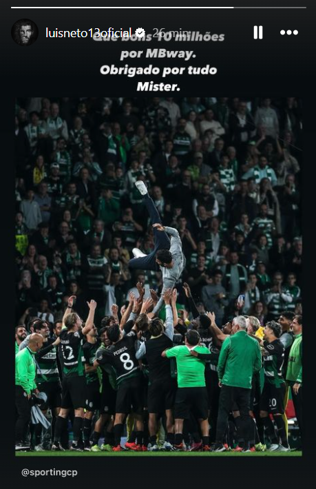 «Que bons €10 M por MB Way. Obrigado por tudo, mister», escreveu o ex-jogador dos verdes e brancos, fazendo referência ao valor pago pelo Sporting ao SC Braga, em 2020, para garantir Rúben Amorim.