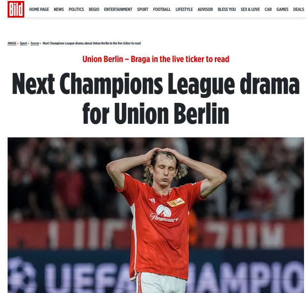 A imprensa alemã refere que ficou um «sabor amargo». Comecemos pelo jornal Bild, que fala em «drama na Champions». «Estreia amarga em casa para o Union! Perde o seu primeiro jogo em casa na Liga dos Campeões já na compensação. É a sexta derrota consecutiva. No início parecia que os berlinenses iriam somar os primeiros pontos na Liga dos Campeões», escreve.