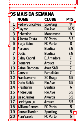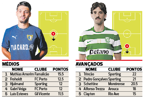 Destaque ainda para o sempre perigoso Clayton, a bisar e fazer uma assistência no empate rioavista em Arouca; Schettine, em grande momento ao apontar os dois golos do triunfo moreirense; e Alberto Costa, que a marcar e assistir, esteve em dois golos do triunfo portista, no qual Borja Sainz se destacou ao bisar.
