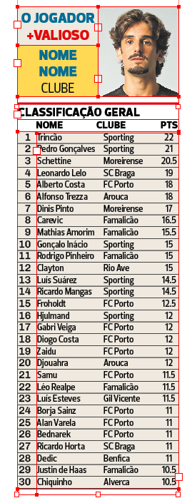 Com uma exibição menos conseguida relativamente às realizadas nas duas rondas iniciais — apesar disso foi fundamental ao fazer o roubo de bola que deu início à jogada do 1-1 — Trincão somou apenas dois pontos na Choupana, mas ainda assim mantém a liderança da classificação de O jogador mais valioso de A BOLA da Liga, tendo agora o companheiro Pedro Gonçalves (vencedor em 2020/21) no 2.º lugar.