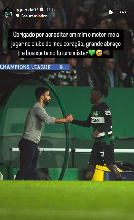 «Obrigado por acreditar em mim e meter-me a jogar no clube do meu coração, grande abraço e boa sorte no futuro mister», escreveu Quenda no Instagram.