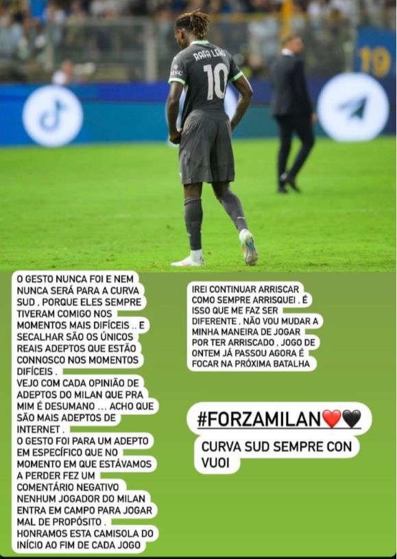 O Milan perdeu este sábado com o Parma e e a equipa foi assobiada. Rafael Leão foi alvo de alguns assobios por parte dos adeptos da sua equipa no setor visitante e, depois de protagonizar uma assistência para o golo de Pulisic, perdeu a paciência - parou por baixo do setor visitante, apontando para um ponto específico da curva, mandando calar as críticas.