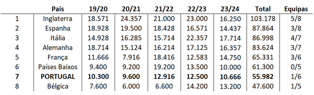 Mas há mais: se o Benfica não pontuar, ou seja, se perder os dois jogos dos quartos de final, a Liga sabe já que começa a próxima época...pior do que aquilo que está agora. Como assim? O ranking é feito num conjunto de cinco temporadas e o que está em vigor colocar o período entre 2019/20-2023/24. Neste, a Liga tem uma diferença de 5,31 para os Países Baixos, mas como a temporada de 2019/20 desaparece assim que começar nova época, a vantagem neerlandesa sobe para 6,21. O motivo? Em 2019/20 Portugal fez manifestamente melhor do que os Paises Baixos: 10,3 vs 9,4.