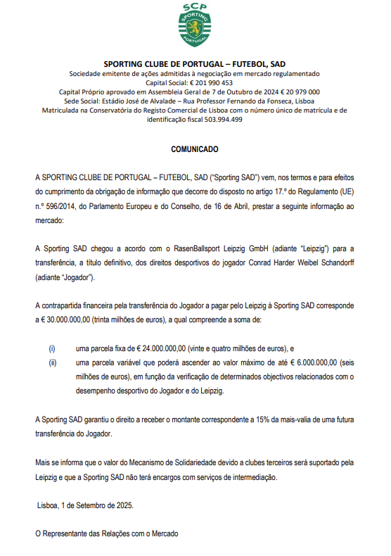 «O valor do mecanismo de solidariedade devido a clubes terceiros será suportado pelo RB Leipzig e a Sporting SAD não terá encargos com serviços de intermediação», esclarecem os leões sobre diretos de formação e comissões.