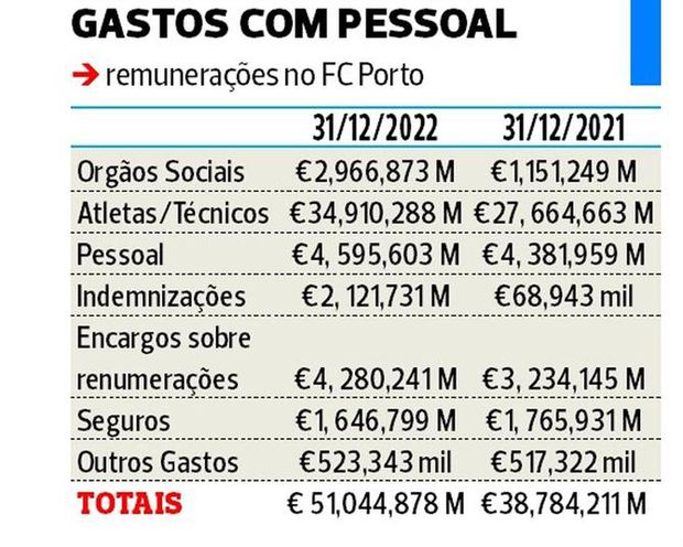 Os custos salariais relativos aos plantéis de futebol, equipas técnicas e demais estruturas da SAD do FC Porto, incluindo os Órgãos Sociais, passaram de €38,7 milhões no primeiro semestre de 2021 para 51,044 milhões no período homólogo de 2022, a que se refere o atual Relatório e Contas da SAD 2022/2023, cujo resultado líquido foi negativo em quase €9,9 milhões.