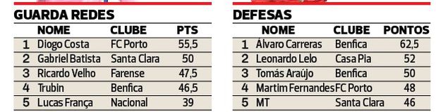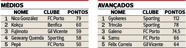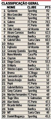 E se a única alteração no top-10 corresponde à reentrada de Gabriel Silva (9.º), autor do golo que valeu o empate do Santa Clara no Dragão, o maior destaque da jornada é mesmo Nuno Moreira (13.º), o melhor em campo em Rio Maior onde marcou e realizou impressionante exibição. Numa semana que viu os melhores terem a mais baixa pontuação da época e portanto com poucas mudanças significativas na tabela, referência ainda para o salto de quatro posições de Geny Catamo (23.º) que entrou a tempo de assistir para o segundo dos leões.