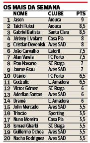 Referência ainda para o central Devenish, importante no desvio no canto de onde saiu o golo da vitória do Aves SAD; e João Carvalho, autor de estonteante bailado seguido de toque com a pontinha da bota no lance do triunfo estorilista.