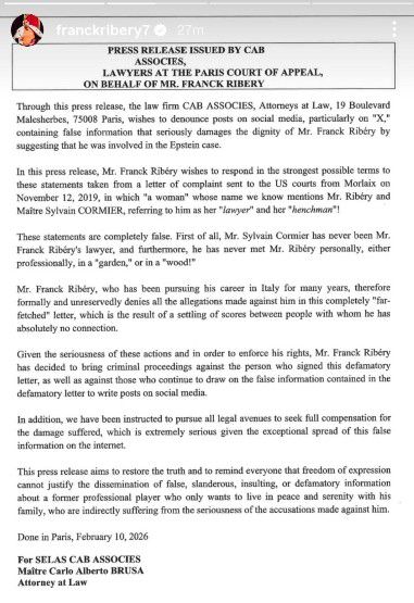 Franck Ribéry, antigo internacional francês, rejeitou veementemente as alegações que o ligam aos ficheiros de Jeffrey Epstein e anunciou que irá instaurar um processo-crime contra os responsáveis.