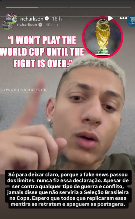 Richarlison, veio a público negar categoricamente uma publicação que lhe foi atribuída, na qual era garantido que iria boicotar o Campeonato do Mundo de 2026 caso o conflito no Médio Oriente, intensificado pelos ataques americanos e israelitas ao Irão, persistisse.