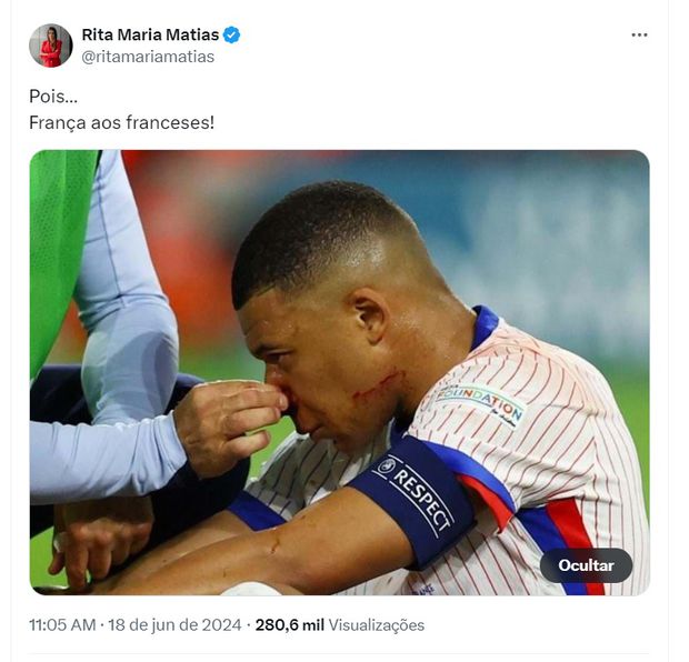 Kylian Mbappé fraturou, ontem, durante o jogo da França com a Áustria, para o Euro 2024, o nariz e Rita Matias, deputada do Chega e da Assembleia da República, tirou partido da situação para 'atacar' o jogador.