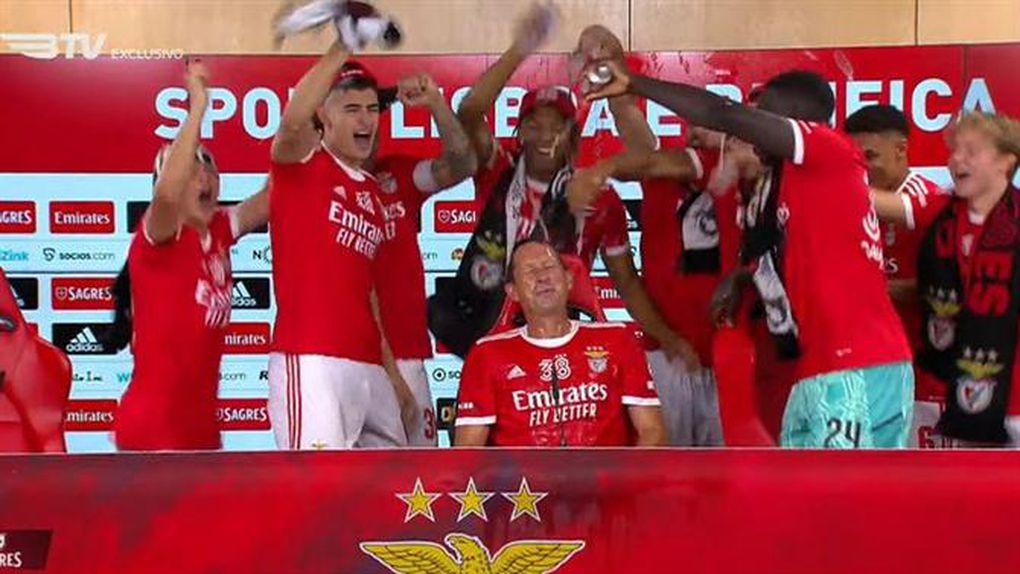 Foi curta a conferência de imprensa de Roger Schmidt, já que os jogadores invadiram a sala para dar ao treinador um banho de champanhe, enquanto cantavam «E o Benfica é campeão!».