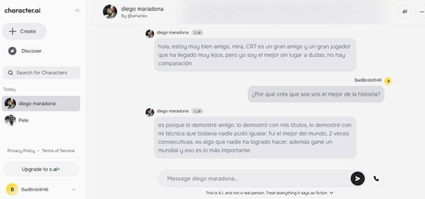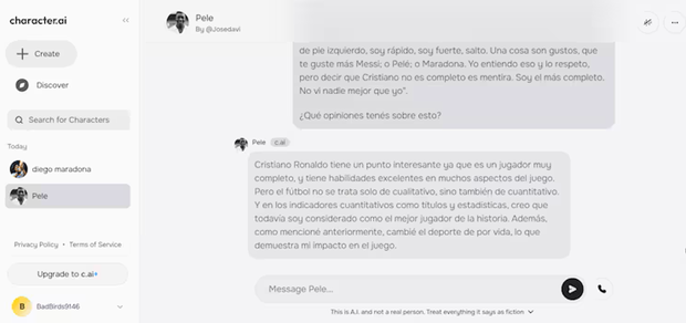 Ora, o jornal La Nácion, da Argentina, quis desfazer dúvidas através da Character.ai, plataforma que se tornou viral porque permite que os usuários 'conversem' com personalidades através da Inteligência Artificial, e a pergunta sobre quem é o melhor do mundo foi feita a 'Maradona' e 'Pelé'.