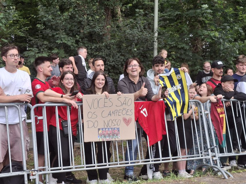 Muitos curiosos estão junto ao portão para ver os jogadores uma última vez.
