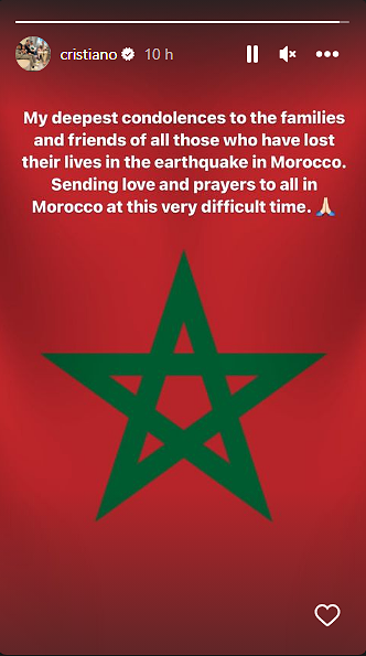 Cristiano Ronaldo recorreu às redes sociais para deixar uma mensagem solidária para as vítimas do sismo que ocorreu em Marrocos na última sexta-feira e que fez mais de 2 mil mortos e muitos feridos graves.