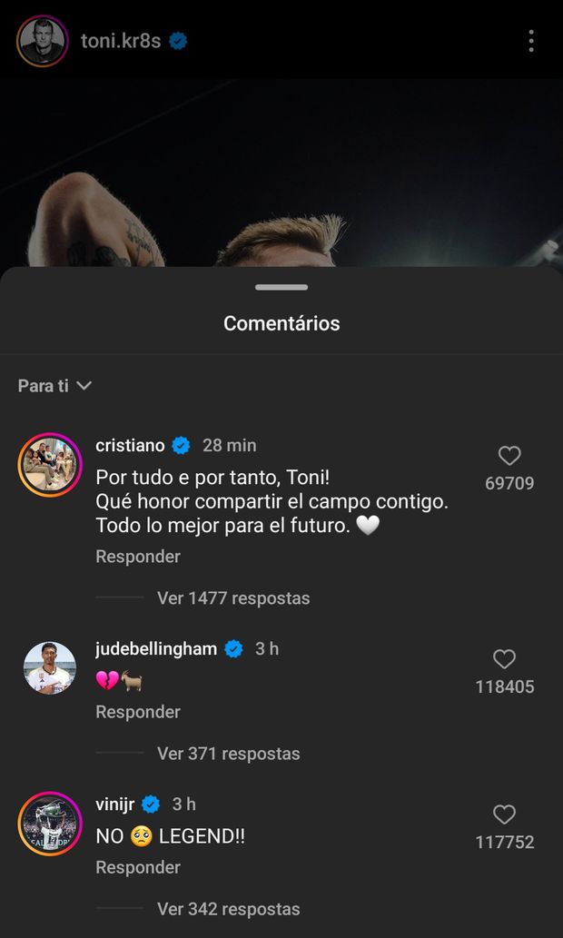 «Por tudo e por tanto, Toni! Que honra ter partilhado o campo contigo. Tudo de bom para o futuro», escreveu o capitão da seleção portuguesa na publicação de Kroos no Instagram.