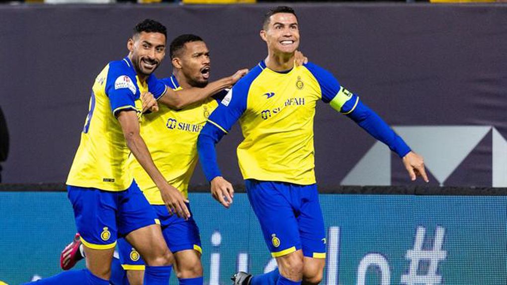Cruzamento desde a direita e Cristiano Ronaldo, no coração da área, foi às alturas para cabecear para o fundo da baliza, dando vantagem ao Al Nassr frente ao Al Raed.
