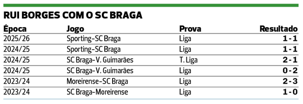 Este domingo, na Pedreira, será o terceiro jogo de Rui Borges, enquanto treinador leonino, frente aos guerreiros. Mas o sexto, contabilizando também os encontros ao serviço do V. Guimarães e do Moreirense. Pelos cónegos, em 2023/2024, perdeu os dois jogos do campeonato: 2-3 em casa e 0-1 em Braga. Pelos vimaranenses, em 2024/2025, na primeira metade da época, antes de ingressar no Sporting, defrontou os bracarenses por duas vezes. Perdeu para a Taça da Liga, em Braga (1-2), mas venceu para o campeonato (2-0), também em Braga. Foi a 15 de setembro de 2024, na 5.ª jornada, com golos de João Mendes (52’) e Tomás Ribeiro (59’).