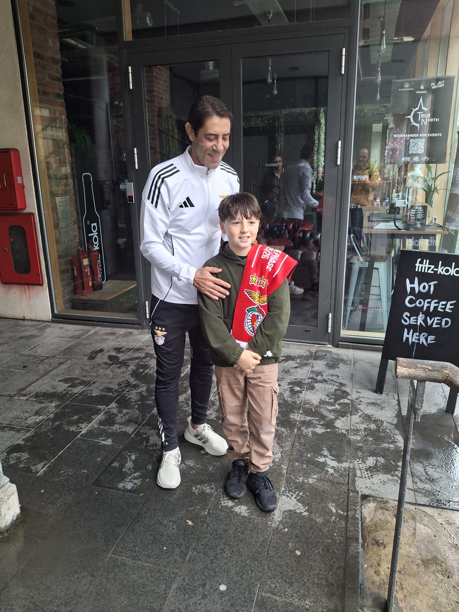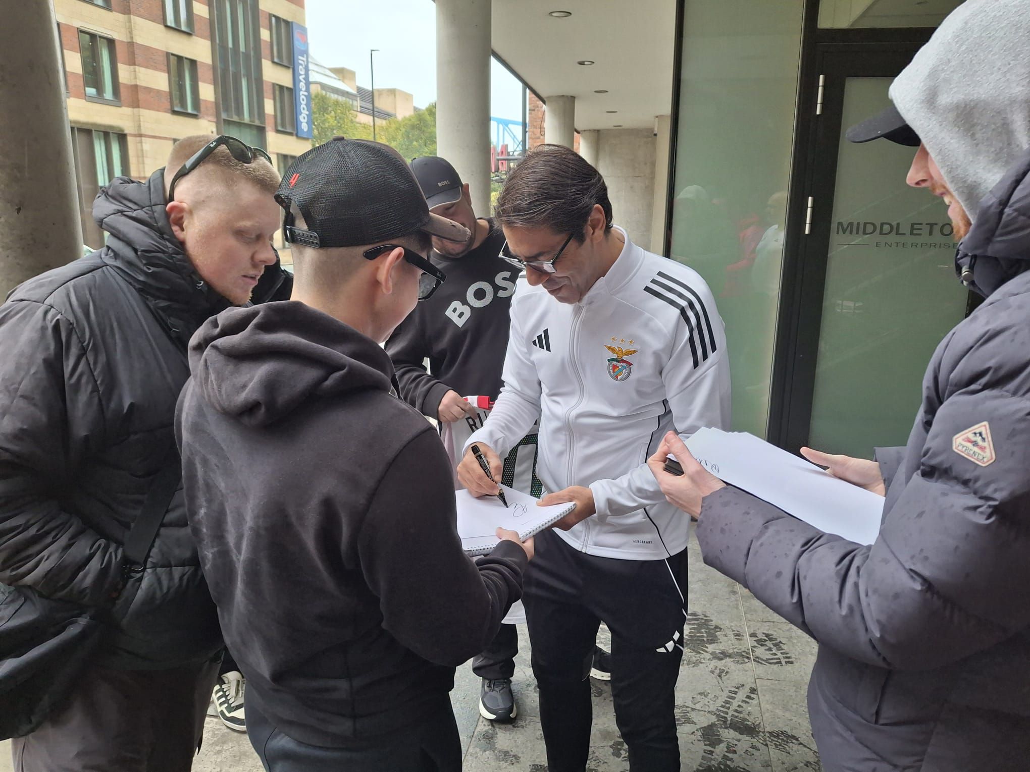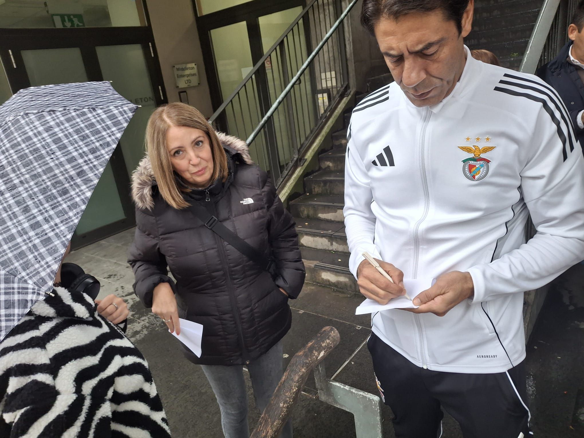 O dirigente atravessou a rua e partilhou alguns momentos de convívio com os presentes, distribuindo autógrafos e posando para algumas fotografias. Mas os benfiquistas não foram os únicos a rejubilar com a presença de Rui Costa. Também alguns adeptos ingleses, recordados dos tempos de futebolista do Maestro, quiserem eternizar o momento.