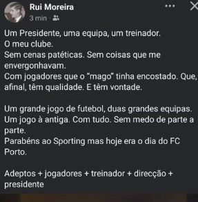 No texto, Rui Moreira destaca a união presente, ao dia de hoje, entre os portistas, «sem cenas e patéticas e que envergonhavam», e não esquece Sérgio Conceição, antigo treinador que foi substituído por Vítor Bruno, recordando o edil os «jogadores que o 'mago' tinha encostado e que afinal têm qualidade e vontade», referindo-se a Iván Jaime. O médio ofensivo tinha sido afastado no final da época passada por Sérgio Conceição por alegada falta de compromisso e teve papel decisivo para a conquista do troféu, ontem.