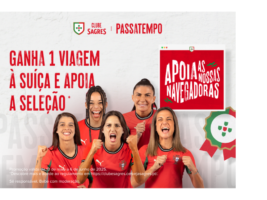 A Sagres volta a brindar os verdadeiros adeptos com uma oportunidade única: o passatempo “Apoia as nossas navegadoras”, promovido pelo Clube Sagres em parceria com A BOLA, oferece a 8 adeptos a hipótese de assistir ao vivo ao confronto entre Portugal e Espanha, no UEFA Euro Feminino 2025.