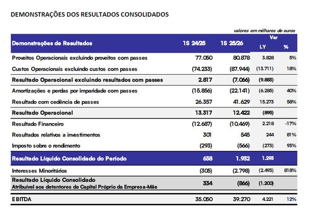Do lado da despesa, os custos operacionais (excluindo passes) subiram 18% para 87,9 M€, refletindo o investimento na equipa principal. Contudo, o EBITDA (Cash Flow Operacional) melhorou, fixando-se nos 39,3 M€ (vs 35,1 M€ no período homólogo).