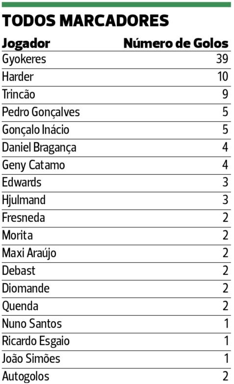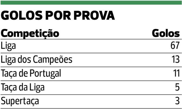 No entanto, esta marca, a confirmar-se, ainda ficará longe da alcançada na época passada, quando o leão em exclusivo de Ruben Amorim chegou aos 141 golos nos 54 desafios de toda a temporada, numa média de 2,6 golos por jogo