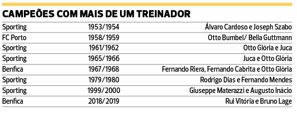 O Benfica era, até agora, a única equipa portuguesa que já venceu um campeonato com três treinadores numa mesma época. Aconteceu em 1967/1968, quando Fernando Riera fez os primeiros sete jogos, seguiu-se Fernando Cabrita com 14 e, por fim, Otto Glória com os últimos cinco. O Sporting (com Ruben Amorim, João Pereira e Rui Borges), repete assim o Benfica de há 57 anos.