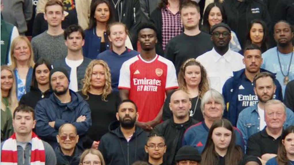 Bukayo Saka surpreendeu 300 adeptos torcedores e membros do staff numa das bancadas do estádio Emirates para mostrar as novas camisolas.
