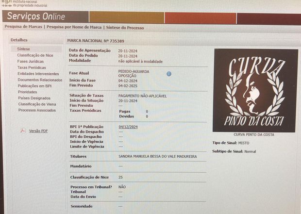 Sandra Madureira, arguida na ‘Operação Pretoriano’ e mulher de Fernando Madureira, o antigo líder da claque Super Dragões, deu entrada nos serviços do Instituto Nacional de Propriedade Industrial com um pedido de registo da marca Curva Pinto da Costa. O pedido foi feito no passado dia 21 de novembro e aguarda aprovação, com data limite até 4 de fevereiro de 2025.