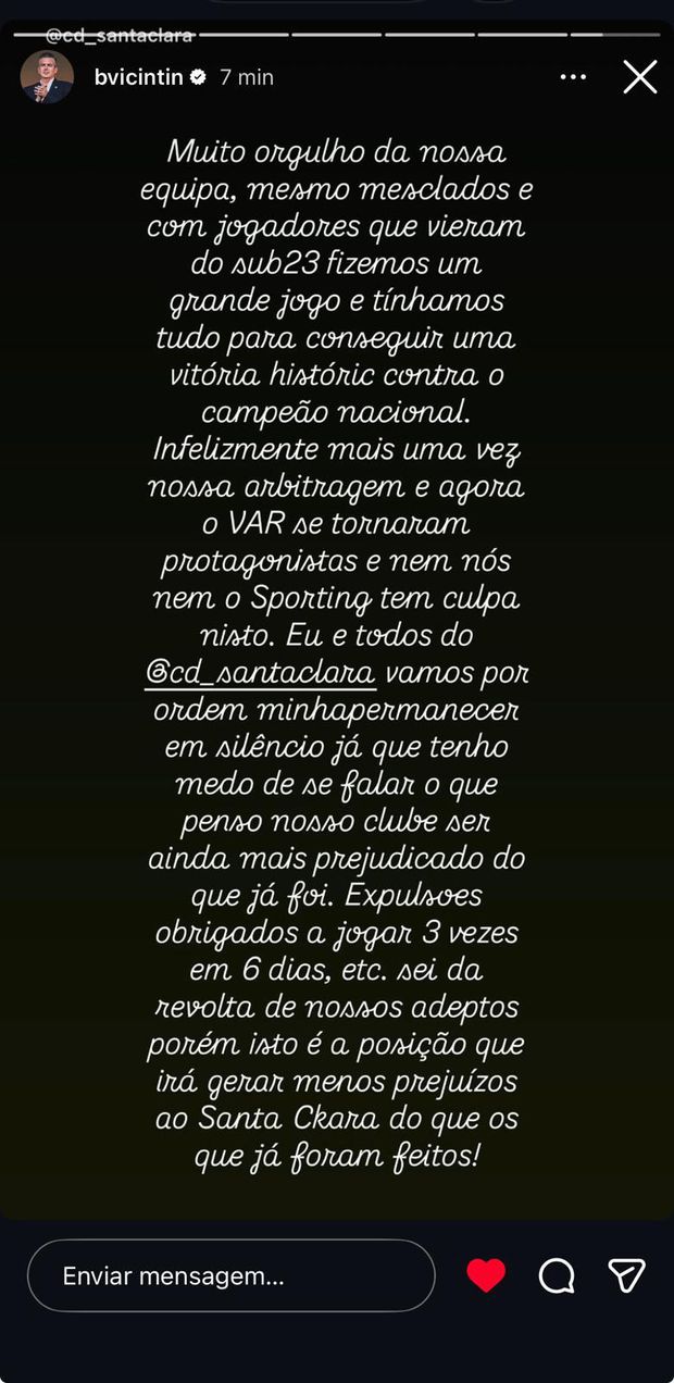 Bruno Vicintin, presidente da SAD do Santa Clara, já reagiu à polémica eliminação na Taça de Portugal diante do Sporting: «Muito orgulho da nossa equipa. Mesmo mesclados e com jogadores que vieram dos sub-23, fizemos um grande jogo e tínhamos tudo para conseguir uma vitória histórica contra o campeão nacional. Infelizmente, mais uma vez a nossa arbitragem e agora o VAR se tornaram protagonistas e nem nós nem o Sporting tem culpa nisto. Eu e todos do Santa Clara vamos, por ordem minha, permanecer em silêncio, já que tenho medo de que se falar o que penso o nosso clube possa ser ainda mais prejudicado do que já foi. Expulsões, obrigados a jogar 3 vezes em 6 dias, etc. Sei da revolta de nossos adeptos, porém isto é a posição que irá gerar menos prejuízos ao Santa Clara além do que os que já foram feitos!»