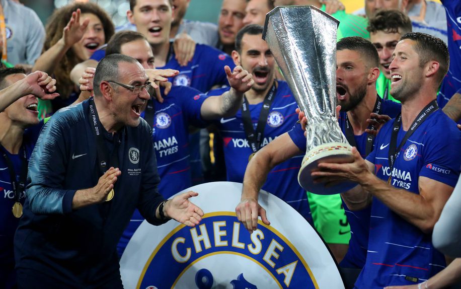 Maurizio Sarri a celebrar a conquista da Liga Europa com os jogadores do Chelsea (Imago)