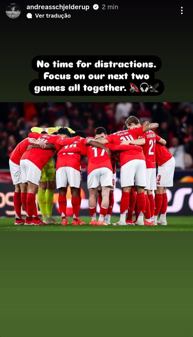 No meio da polémica motivada pelas declarações de Nuno Magalhães, presidente da mesa da Assembleia Geral da SAD do Benfica, Andreas Schjelderup publicou uma foto da equipa encarnada unida num círculo, acompanhada da descrição: «Não há tempo para distrações. Foco nos próximos dois jogos todos juntos.»