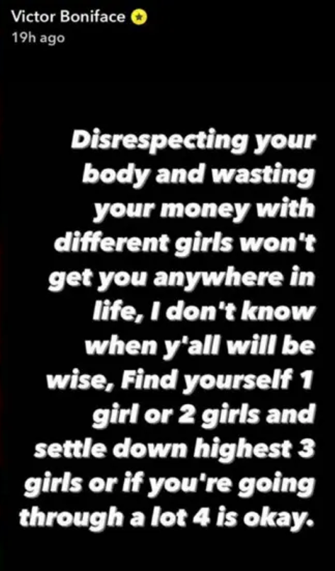 «Faltar ao respeito ao teu corpo e gastar dinheiro com diferentes raparigas não te leva a lado nenhum na vida», começou por escrever. Até aqui, a mensagem parecia inofensiva. Mas rapidamente descambou: «Encontra uma ou duas raparigas e estabelece uma relação. Escolhe três, no máximo. Ou, se estiveres a passar por um momento difícil, quatro está bem.»