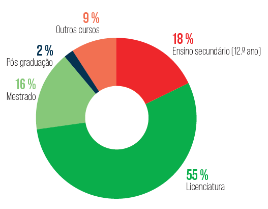 No caso das qualificações de nível superior, o aumento é de 8 pontos percentuais (p.p.) no número de licenciados, de 7 para 15%, e de 3 p.p. no número de inquiridos que completaram o mestrado (de 2 para 5%).
