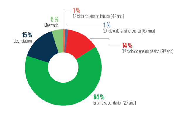 Com 64% dos inquiridos a afirmarem terem completado o 12.º ano, atualmente a escolaridade mínima obrigatória, verifica-se um aumento de 12 pontos percentuais relativamente ao estudo anterior (fig. 1).