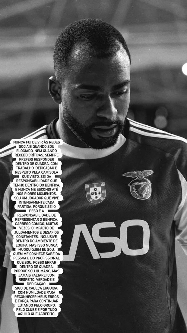 «Sou um jogador que vive intensamente cada partida, porque sei o peso e a responsabilidade de representar o Benfica. Carrego muitas vezes, comigo, o impacto de julgamentos e desafios constantes, inclusive dentro do ambiente de equipa, mas isso nunca mudou quem sou. Quem me conhece sabe da pessoa e do profissional que sou. Posso errar dentro da quadra, porque sou humano, mas jamais faltarei com respeito, verdade e dedicação. Sigo de cabeça erguida, com humildade para reconhecer os meus erros e força para continuar lutando pelo grupo, pelo clube e por tudo aquilo em que acredito», concluiu o internacional brasileiro, que cumpre a sexta época ao serviço do Benfica.