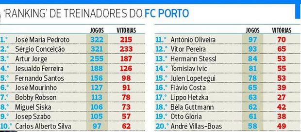 Neste momento, Sérgio Conceição é também o homem que mais triunfos conquistou ao leme da nau portista, mais concretamente 233 - já com a vitória contabilizada no dérbi de anteontem - contra os 215 de José Maria Pedroto, que já ficou para trás no decurso desta temporada. A ultrapassagem ao famoso ‘Zé do Boné’ em termos de partidas oficiais de dragão ao peito será materializada na próxima segunda-feira, em Arouca, em mais uma final que o FC Porto terá pela frente na luta titânica que mantém pelo campeonato com o Benfica e o SC Braga.
