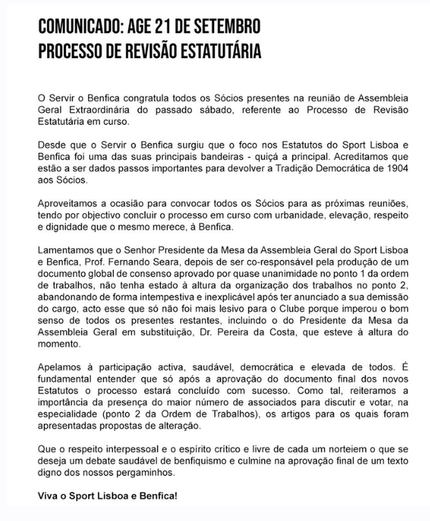 O Movimento Servir o Benfica emitiu um comunicado sobre os acontecimentos da última Assembleia Geral (AG) extraordinária do clube, apontando o dedo a Fernando Seara, que se demitiu do cargo de presidente da Mesa da AG em plena reunião magna.