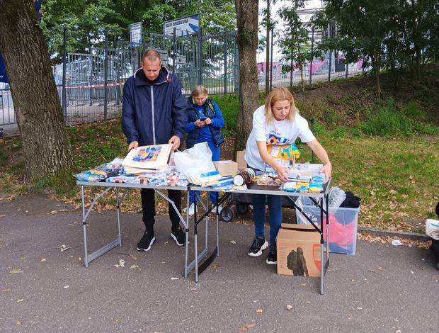 À porta do estádio, ucranianos angariam fundos para a comunidade de refugiados. Só na Alemanha, há mais de um milhão de refugiados que fugiram da guerra na Ucrânia.