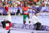 Enquanto a maioria dos rivais iniciam o aquecimento, ele permanece sentado. Muito depois dos outros, levanta-se e ensaia um arranque curto. Caminha depois para o início da pista e faz uma corrida mais forte, antes de voltar a sentar-se.