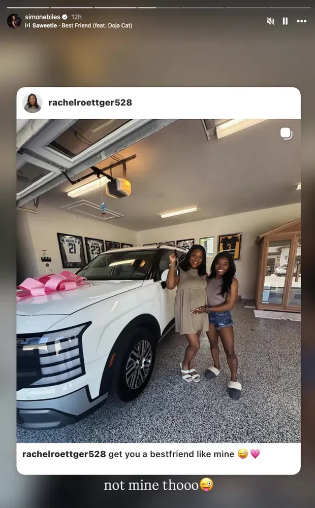 A amiga, Rachel Roettger, também partilhou o momento nas suas redes sociais, publicando uma fotografia ao lado de Biles em frente ao carro. «Arranjem uma melhor amiga do que a minha. A SB surpreendeu-me com o meu carro de mãe de sonho. Para sempre grata por TI», escreveu Roettger. Biles respondeu ao comentário, dizendo: «Amo-te tantoooo».