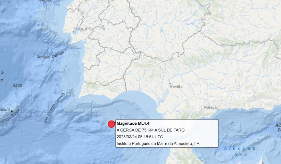 O Instituto Português do Mar e da Atmosfera (IPMA) adianta que o sismo teve o seu epicentro a cerca de 75 quilómetros a sul de Faro e foi registado pelas 5h18 nas estações da Rede Sísmica do Continente.