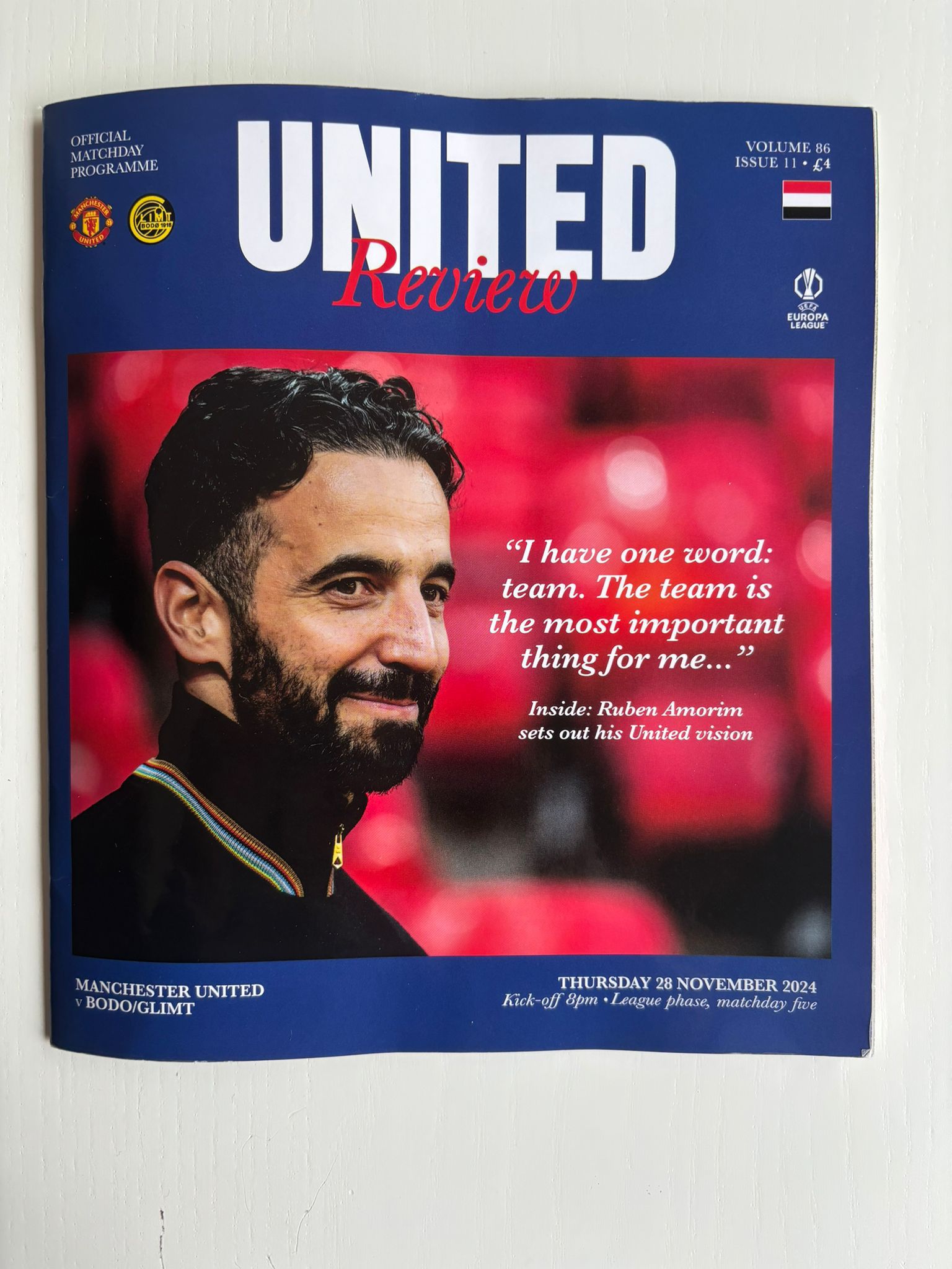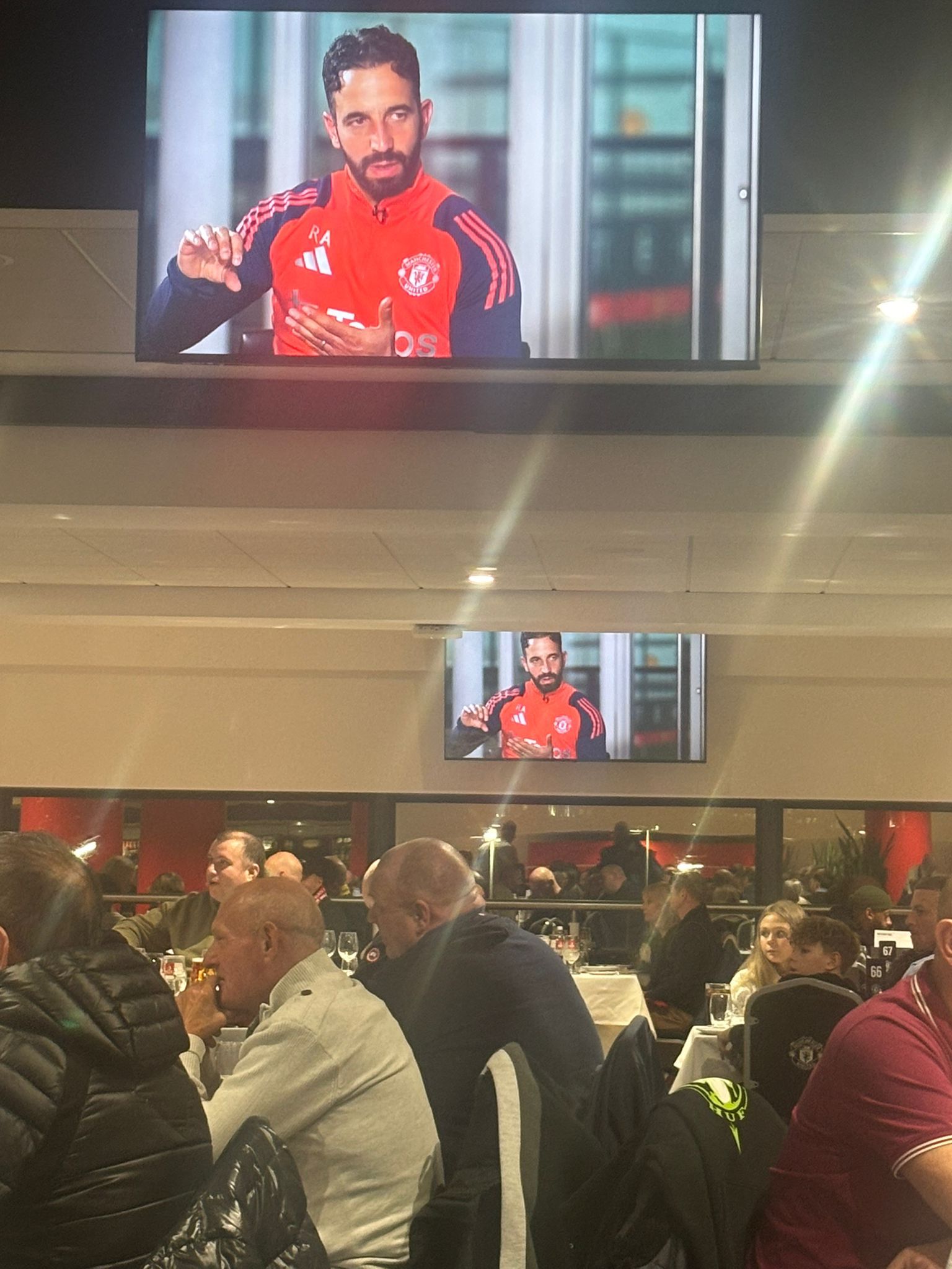 Entra-se na Megastore do United e lá está ele nos ecrãs de TV; espreita-se o programa de jogo, tradição que continua a render em Inglaterra, vendido a quatro libras (€4,80), e lá está Ruben na capa.Estreou-se a escrever na página 5 desta publicação, ato que repetirá a cada jogo em casa, e o próximo é já amanhã. Mas além disso há, neste match programme, várias páginas dedicadas ao novo treinador. Na voluptuosa sala Manchester Suite VIP, é Amorim quem mais se vê nas televisões.