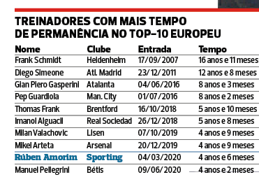 Por fim, a Europa. Só oito treinadores têm, atualmente, mais tempo de permanência num clube do que Amorim. O líder é, a muita distância, o alemão Frank Schmidt, que está há 16 anos e 11 meses no Heidenheim. Assumiu a equipa a 17 de setembro de 2007, totalizando agora 650 jogos consecutivos na equipa do sul da Alemanha. Seguem-se Diego Simeone, Gian Piero Gasperini, Pep Guardiola, Thomas Frank, Imanol Alguacil, Milan Valachovic e Mikel Arteta.
