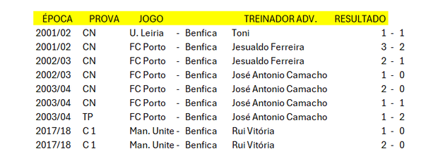 Por fim, a 16 de maio de 2004, no penúltimo jogo de Mou no FC Porto (haveria de bater o Mónaco na final da Champions), única vitória do Benfica sobre uma equipa treinada pelo setubalense: 2-1 na final da Taça de Portugal, triunfo de Camacho sobre Mourinho.
