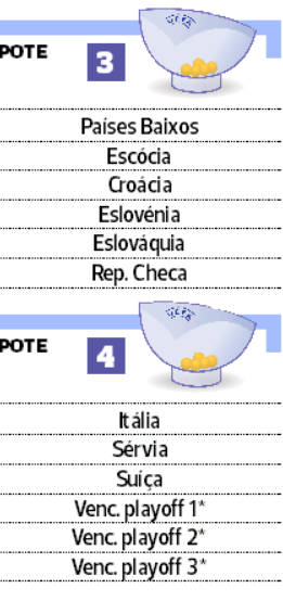 Neste pote estarão ainda Sérvia e Suíça e as três seleções que chegarão por via dos três caminhos do play-off, que será disputado por equipas como Grécia, campeã europeia em Lisboa em 2004, e Polónia, do goleador Robert Lewandowski e presença habitual em fases finais.